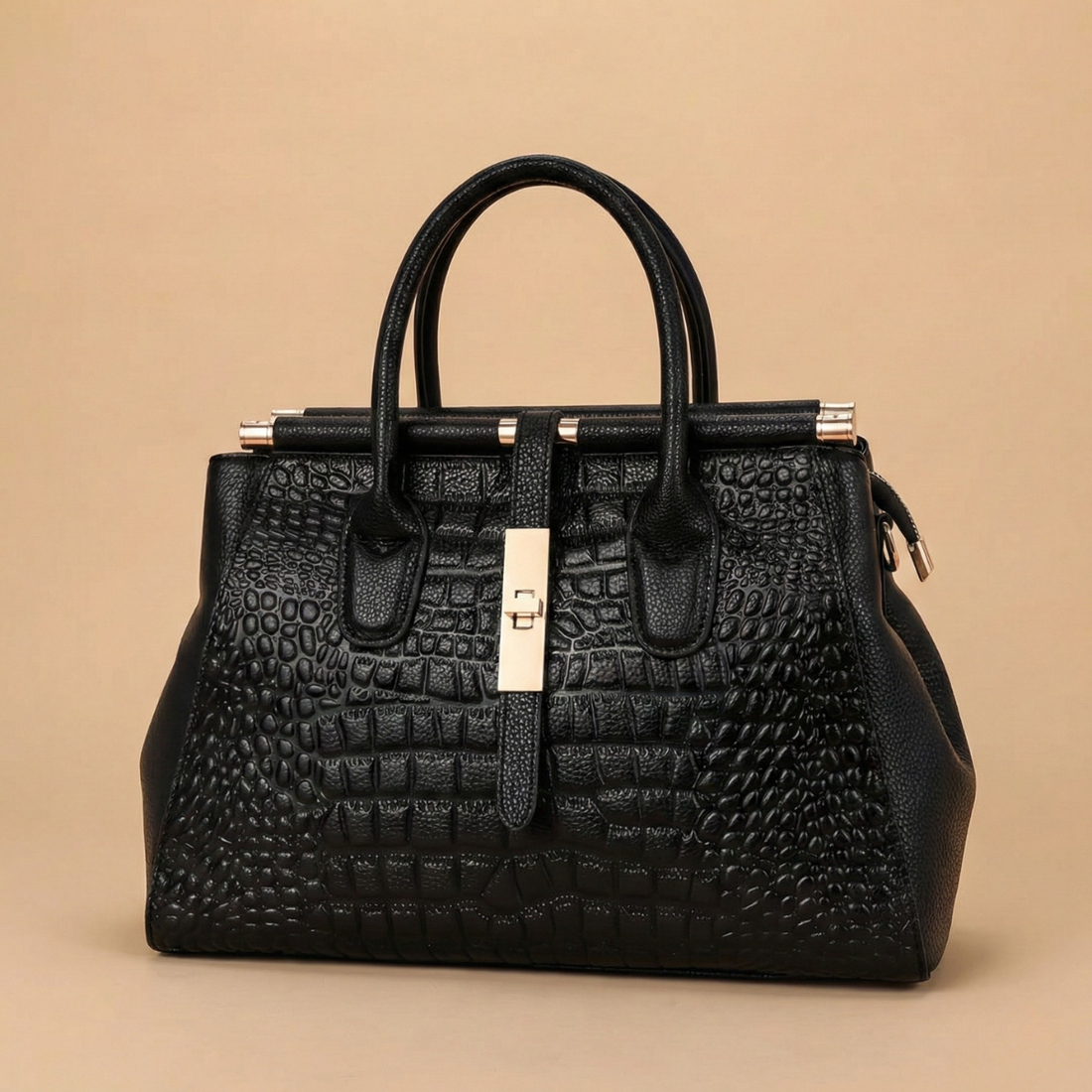 Women’s Structured Top Handle Bag with Embossed Texture and Metal Lock Closure