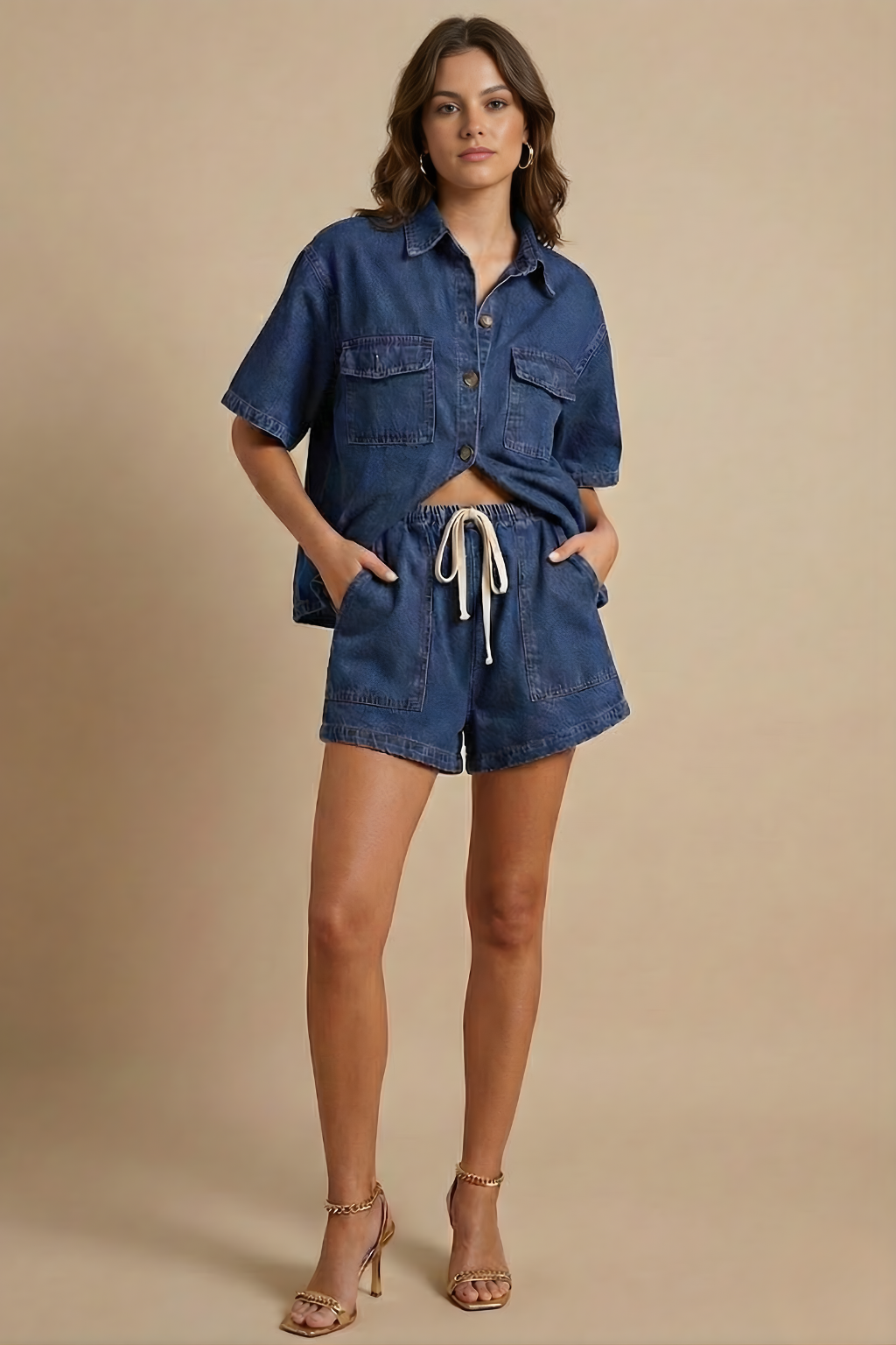 Women’s Two Piece Lounge Set with Short Sleeve Button Top and Relaxed Fit Shorts - Casual Co-ord Outfit