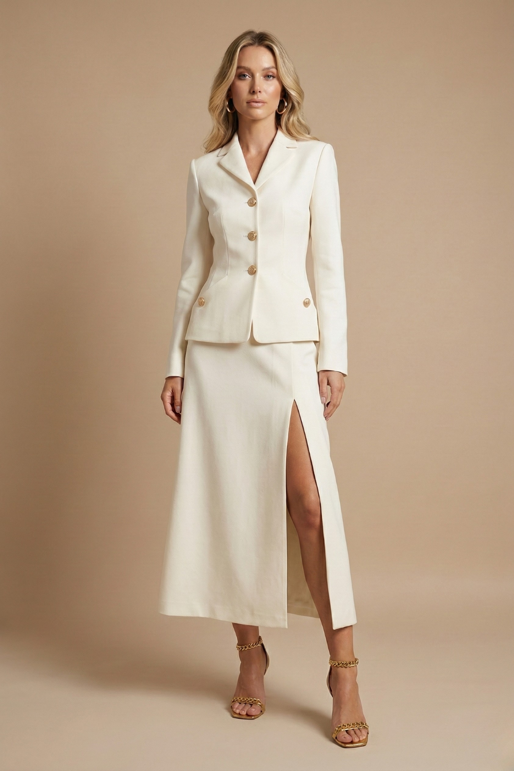Women’s White Two Piece Set with Long Sleeve Tailored Jacket and Midi Skirt with Front Slit Elegant Formal Style