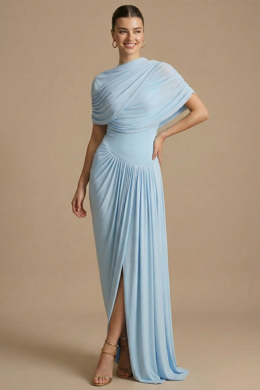 A women’s maxi dress featuring an asymmetrical neckline with layered draping across the bodice. The...