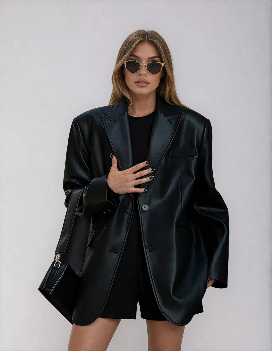 Oversized Faux Leather Blazer Jacket - Relaxed Fit Long Sleeve Lapel - Smart Casual Layer
