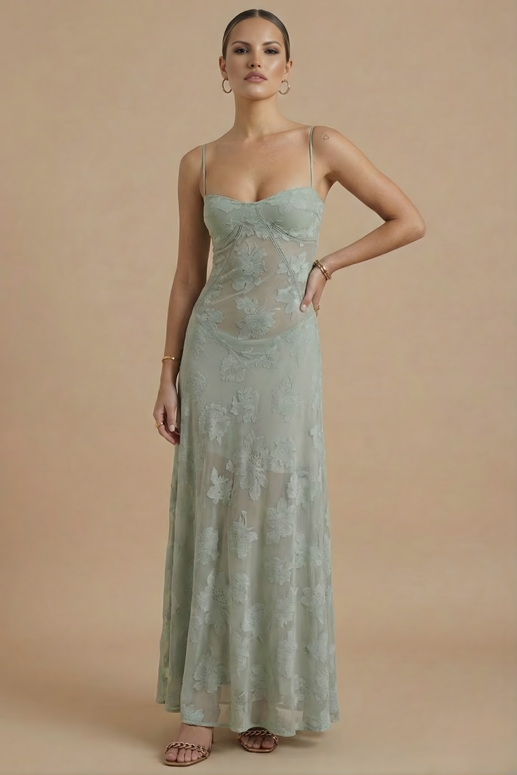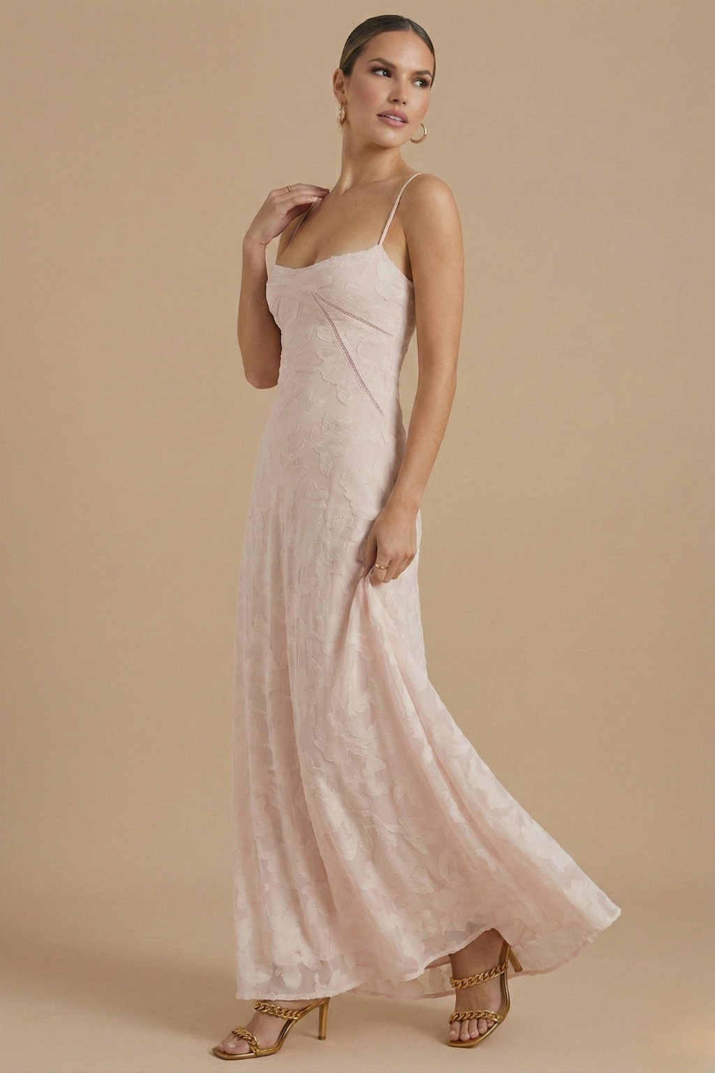 Design: Maxi-length silhouette with delicate straps, shaped bodice, and subtle floral detailing
