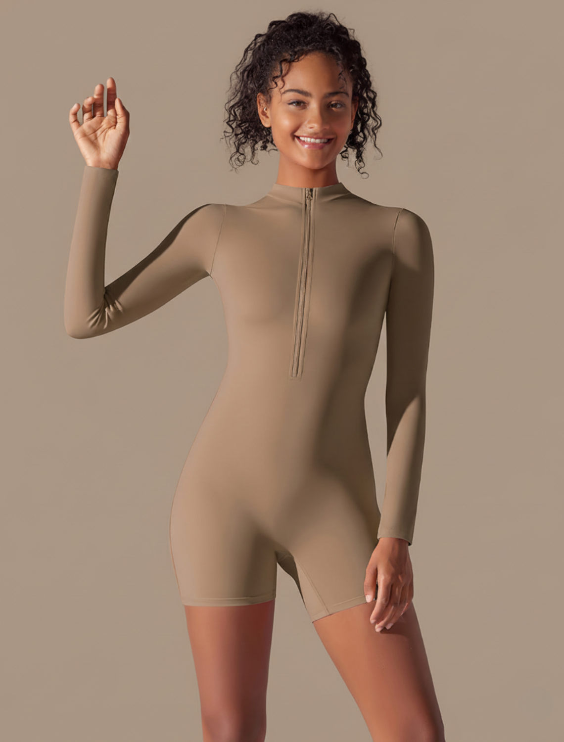 Design: Seamless one-piece jumpsuit with long sleeves, short length, and zip-front closure