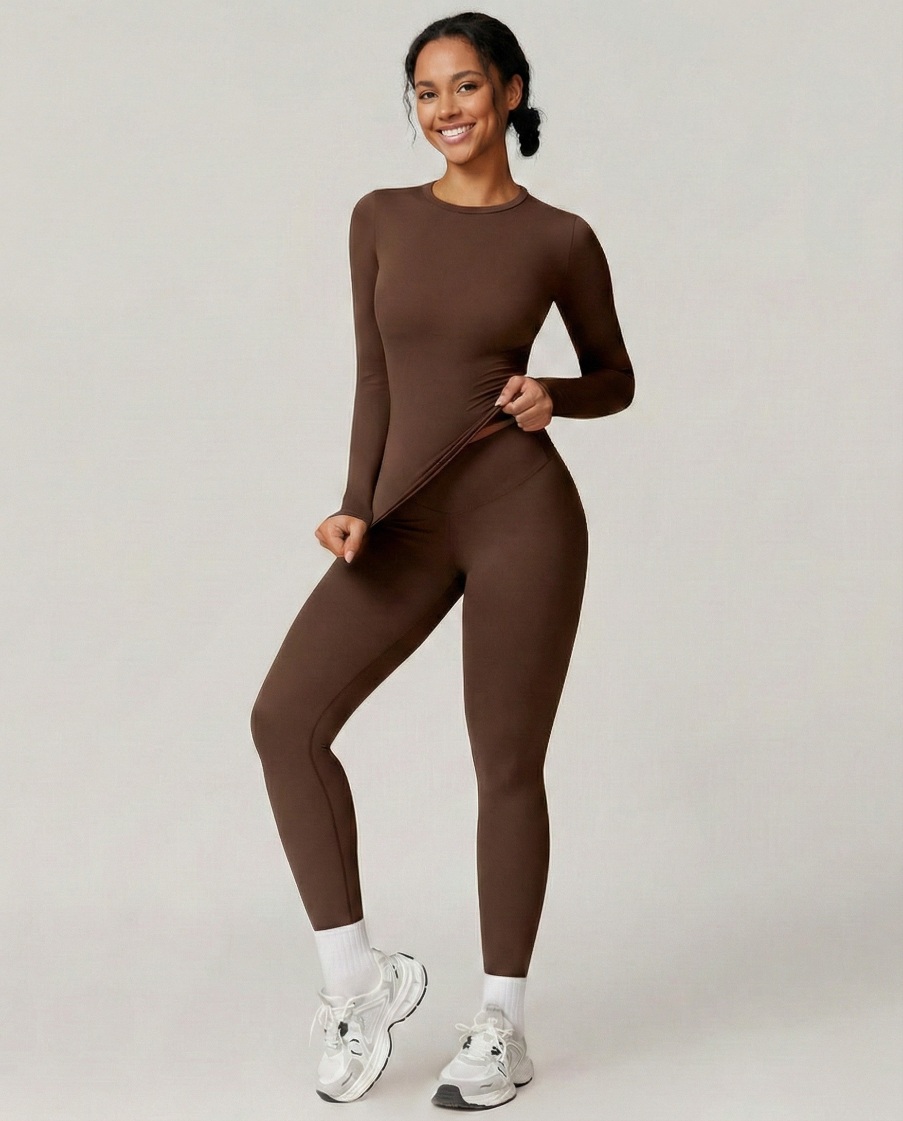 Design: Two-piece matching activewear set with long sleeve top and high-waist leggings