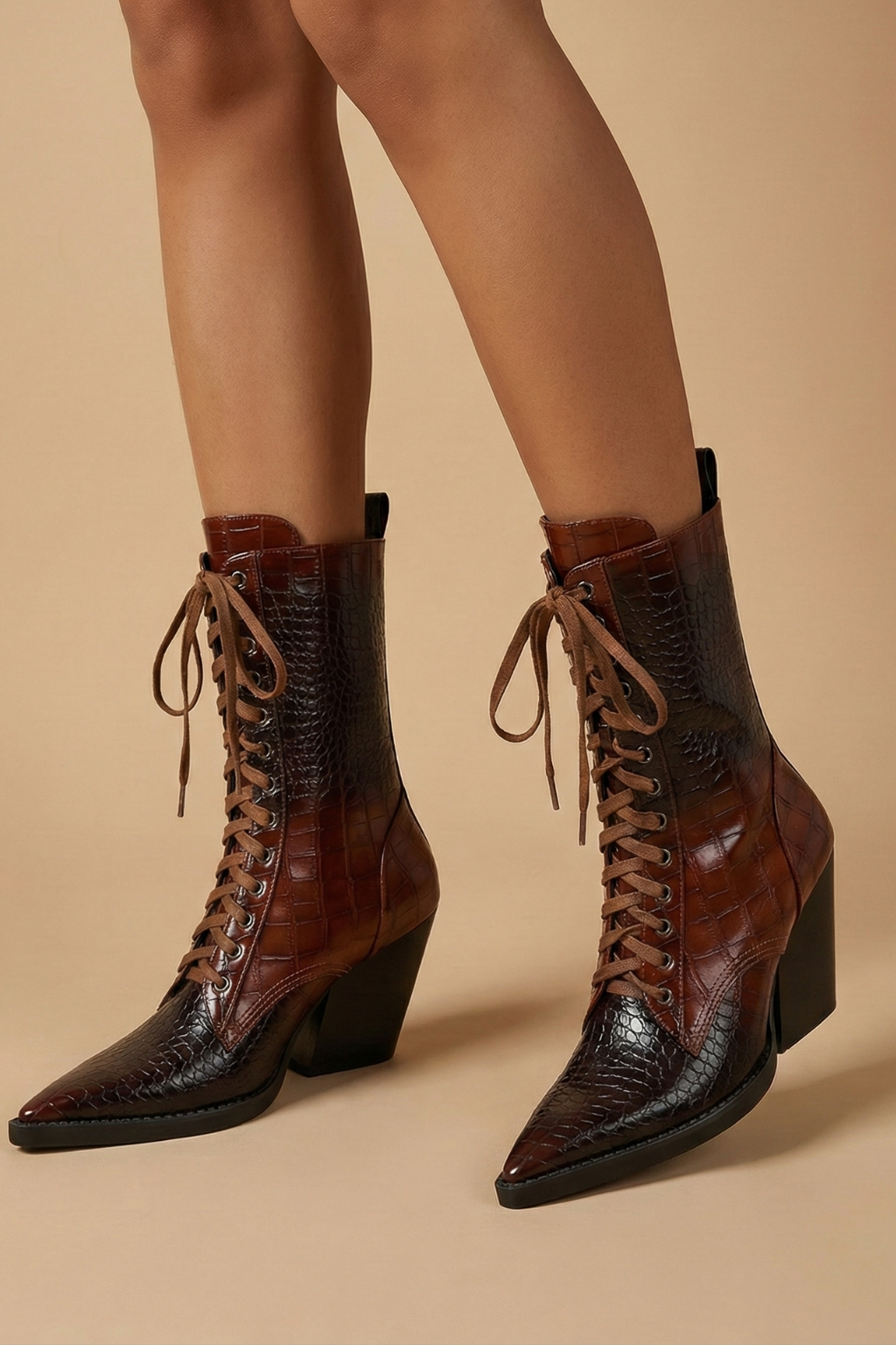A bold silhouette that brings instant polish to any outfit, this lace up ankle boot balances sharp lines with a striking block heel. The pointed toe elongates the leg while the structured heel adds presence without feeling heavy. Finished with refined textural detailing and a secure lace front, it is designed to elevate everyday looks and carry seamlessly into evening plans.