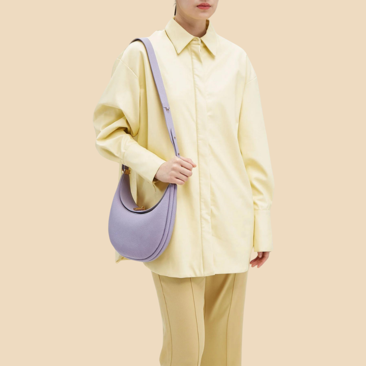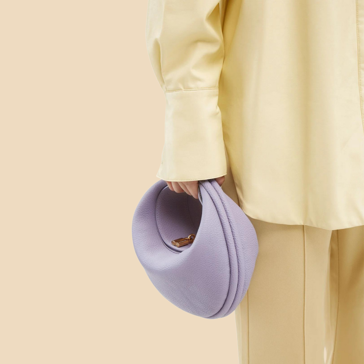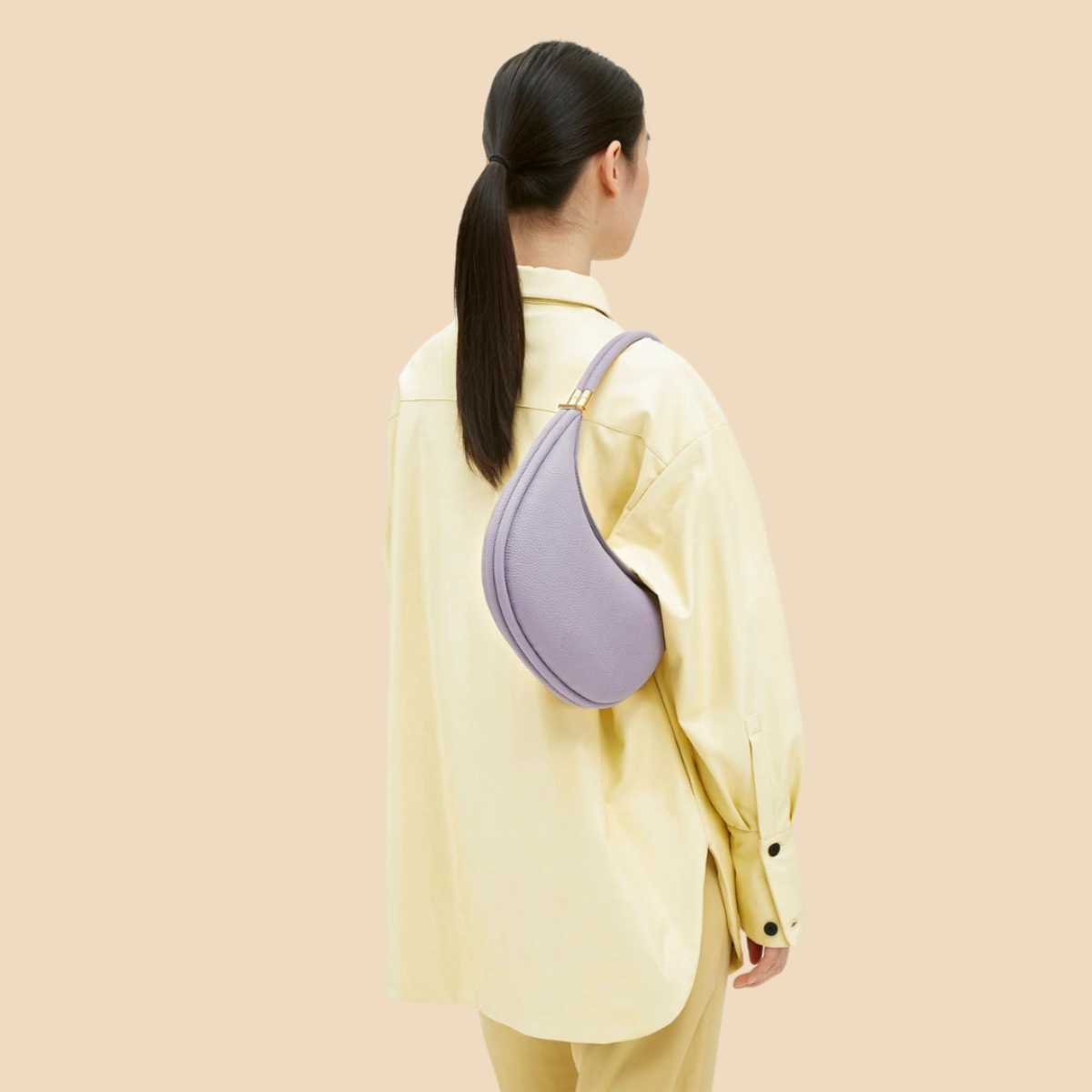 Design: Crescent-shaped shoulder bag with top handle, curved structure, and metal hardware accents