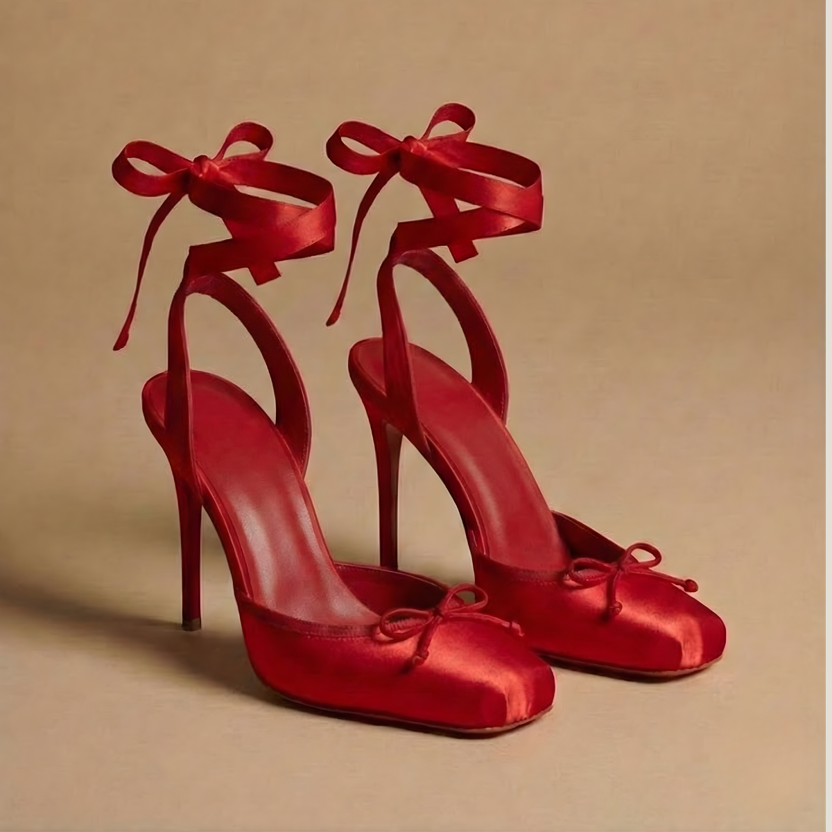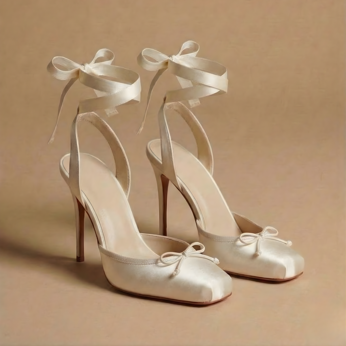 Design: Ballet-inspired high heel with square toe, ribbon ankle ties, and subtle bow detail