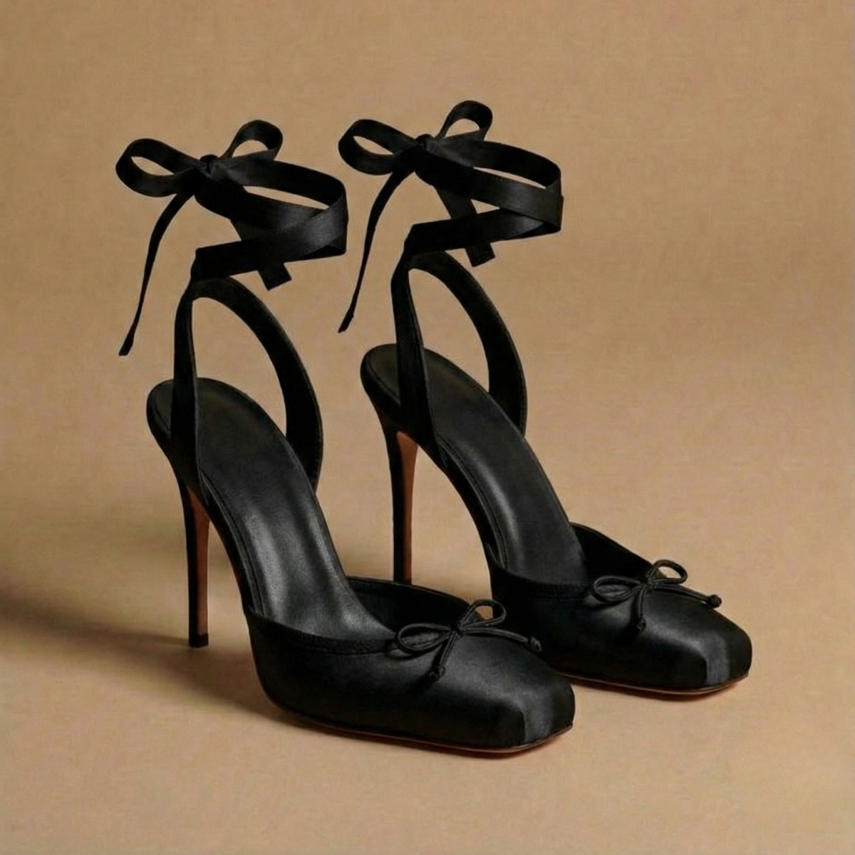 Graceful and refined, these ballet-inspired heels are designed to bring a delicate statement to evening and occasion dressing. The softly structured square toe is balanced by a slim high heel, while the wraparound ribbon ties add a romantic, couture-inspired finish. Elegant yet striking, the silhouette elongates the leg and pairs beautifully with dresses, tailoring, or elevated evening looks where detail and poise matter most.