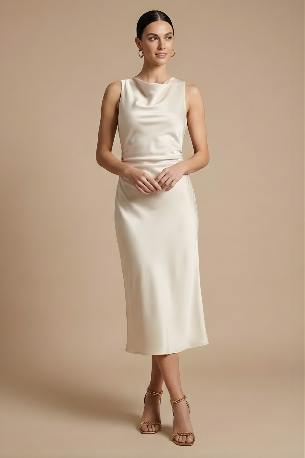 Design: Sleeveless midi silhouette with draped neckline and softly gathered waist detail