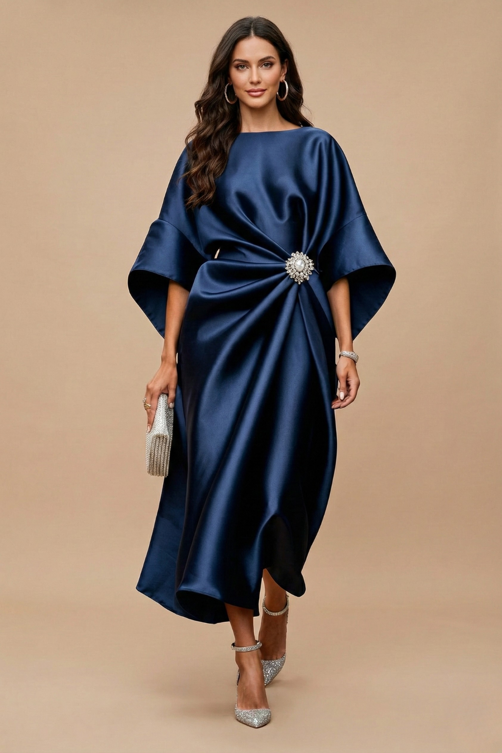 A statement silhouette designed to feel composed and commanding. The wide sleeves create a sculptural shape through the upper body, while soft draping gathers at the waist to draw the eye inward and flatter the form. Falling into a full maxi length, it moves with quiet drama, making it a refined choice for formal evenings and special occasions that call for presence without excess.