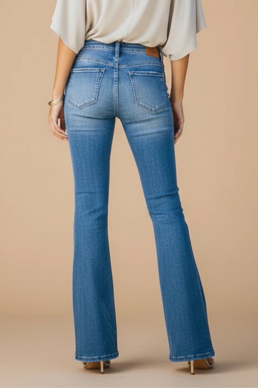 Design: High waist jeans with wide leg cut, full-length hem, front button closure, and classic pocket construction