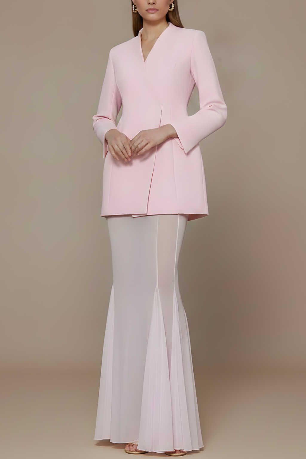 Design: Two-piece set with wrap-front jacket, long sleeves, structured shoulders, and skirt with short inner layer and sheer full-length overlay
