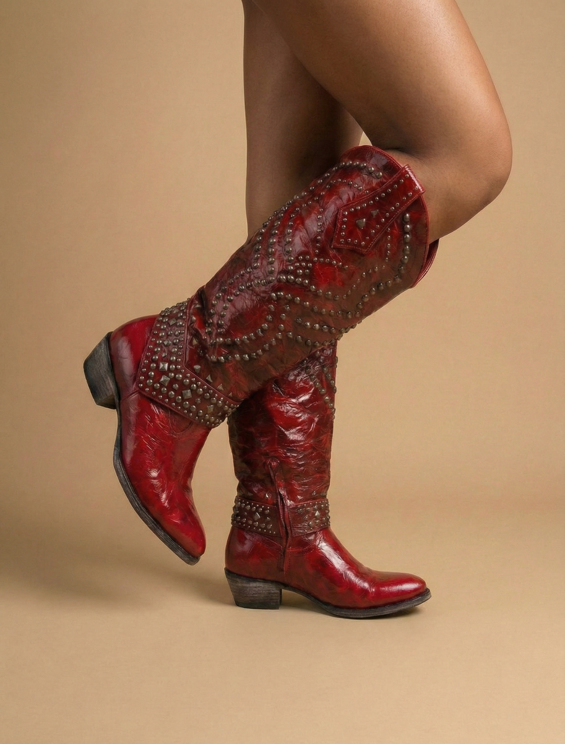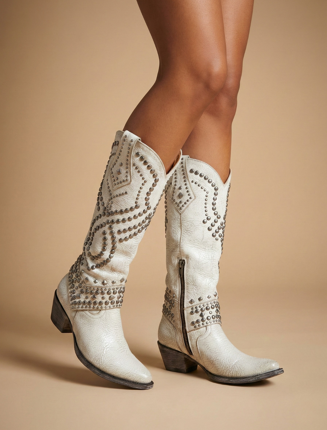 Design: Knee-high Western-style boots with pointed toe, stud detailing, and block heel