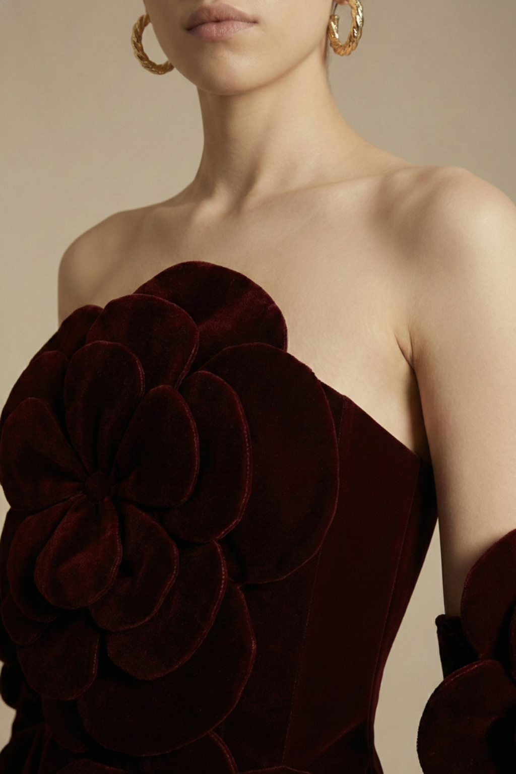 Design: Strapless mini dress with raised floral appliqué detailing, sculpted structure, short hemline, and detachable arm coverings