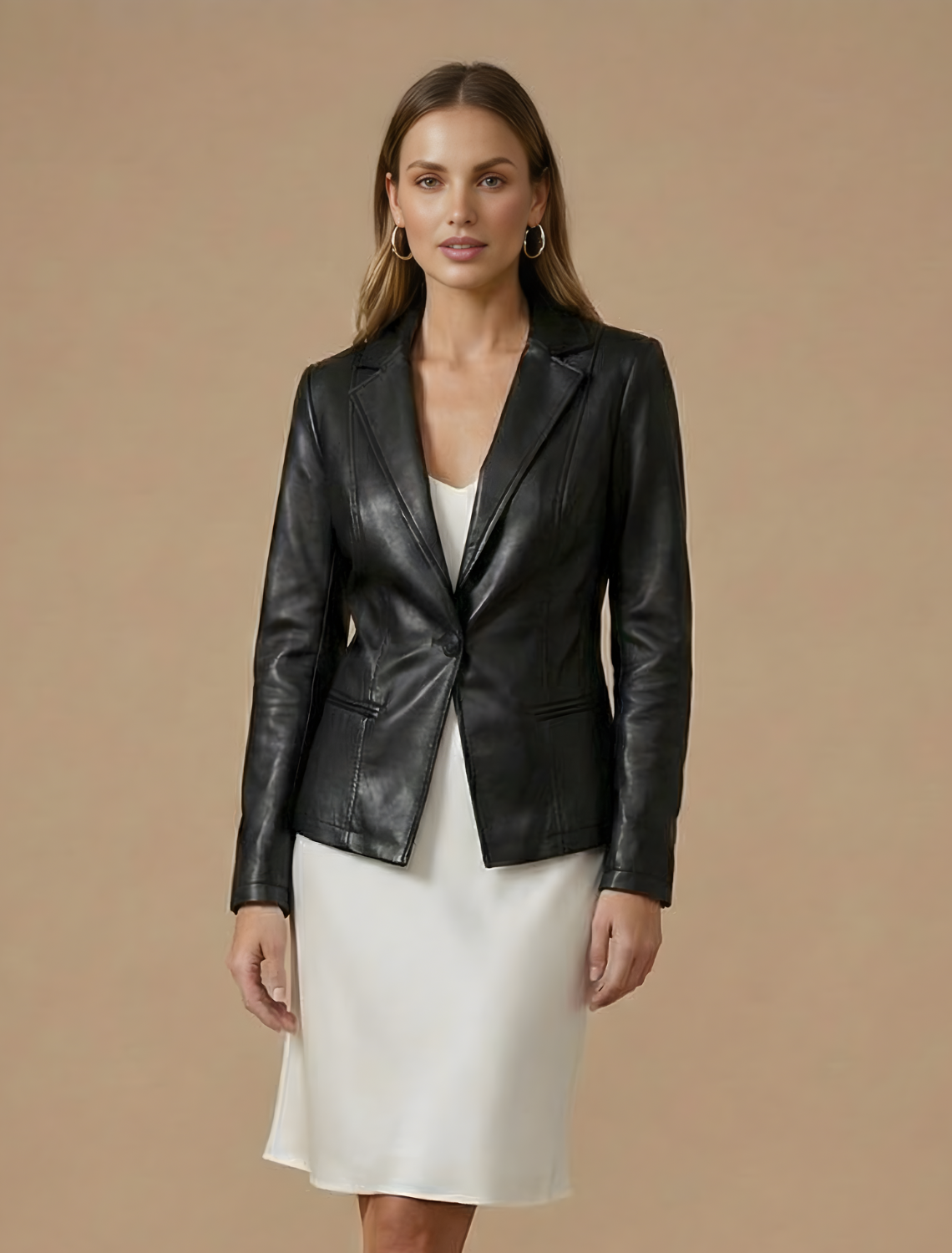 A women’s blazer jacket constructed with a structured silhouette and a single-button front closure. The design features a notched lapel, long sleeves, and shaped seams through the body. Two front welt pockets and a defined hemline complete the streamlined outerwear profile.